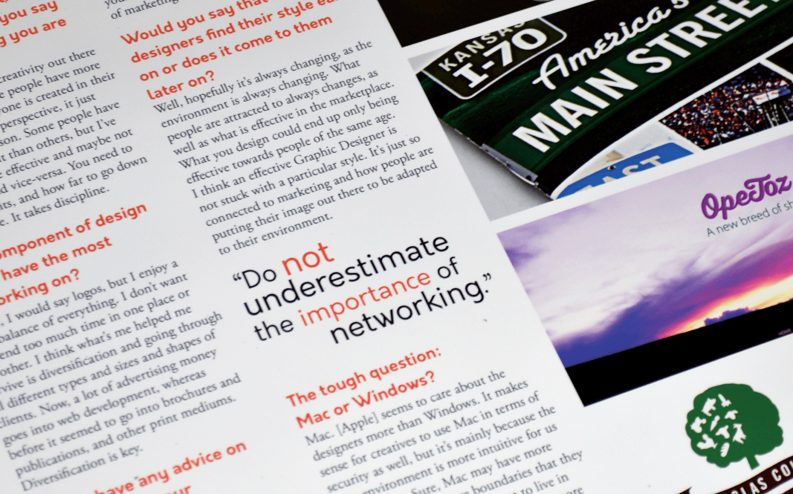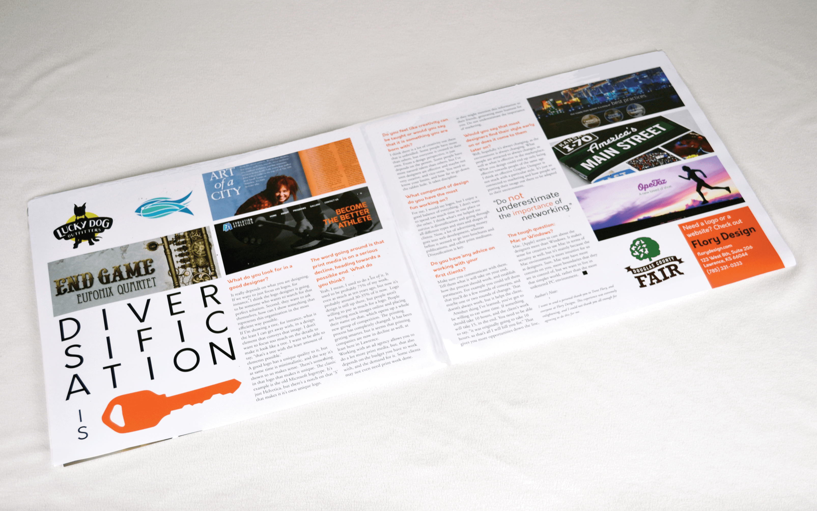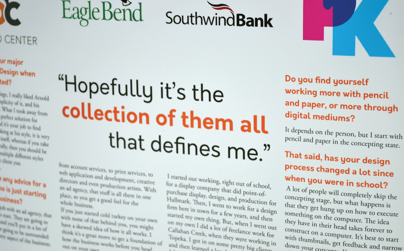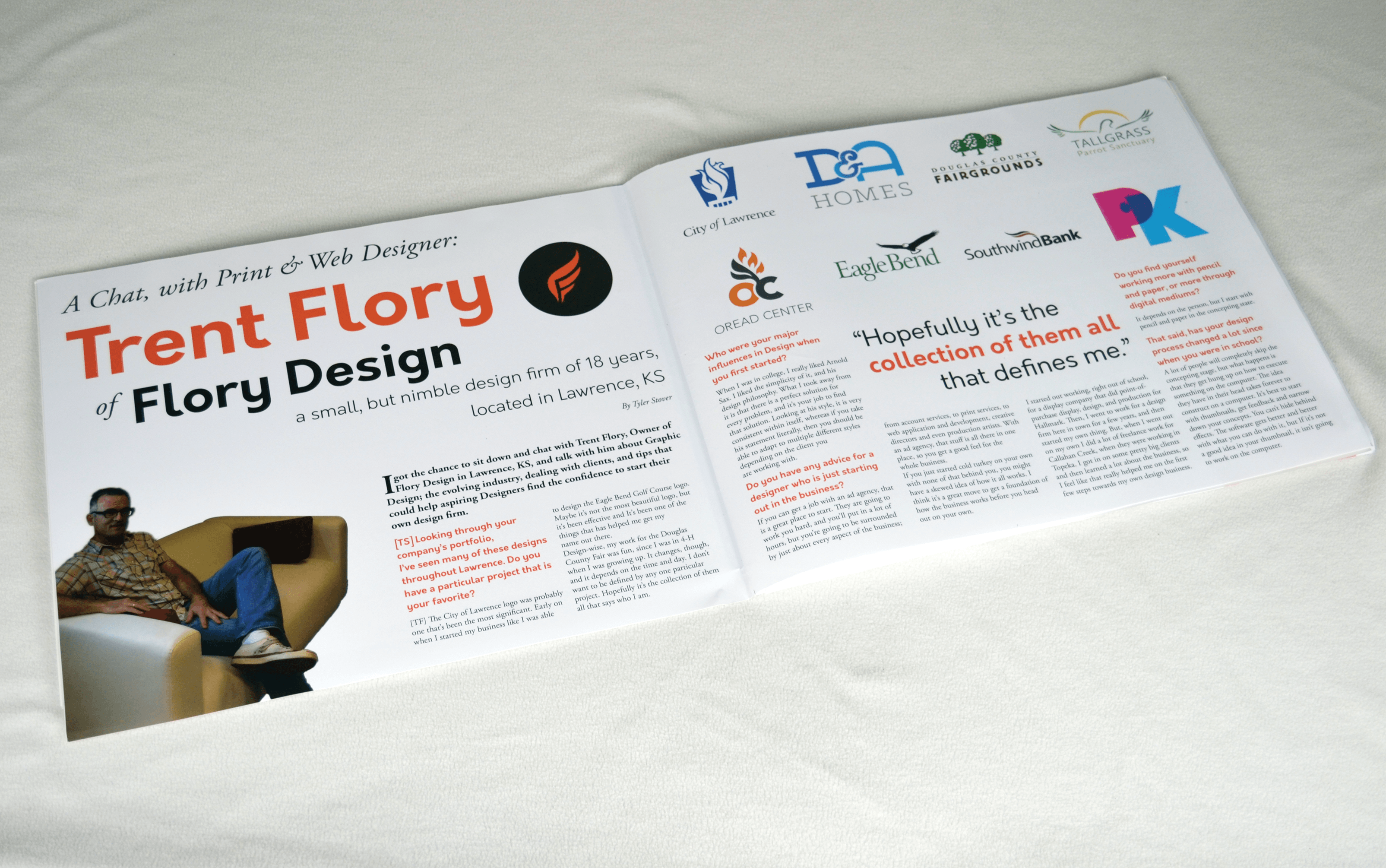 This project was a submission for JCCC’s Graphic Design Publication: Design Speak. It is an annual publication done in class that focuses on designers and the industry as a whole. We got our chance to interview a local designer in any field, and really find out what the industry is really like. Everything from the interview to the final layout is done by the students.